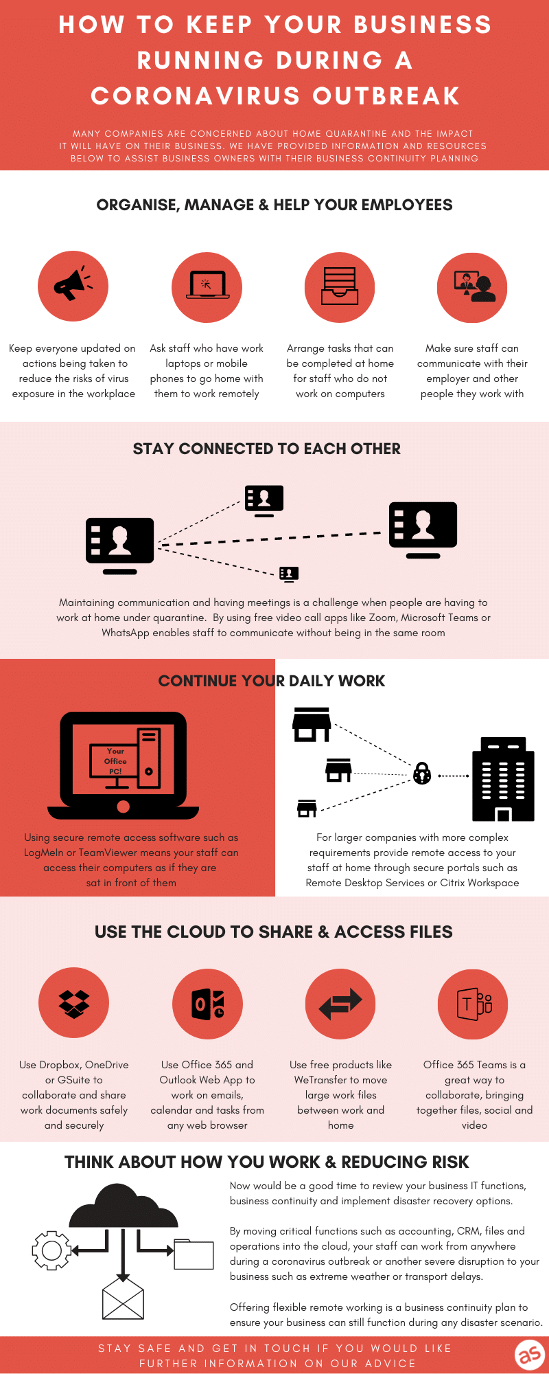 Now would be a good time to review your business IT functions, business continuity and implement disaster recovery options. By moving critical functions such as accounting, CRM, files and operations into the cloud, your staff can work from anywhere during a coronavirus outbreak or another severe disruption to your business such as extreme weather or transport delays. Offering flexible remote working is a business continuity plan to ensure your business can still function during any disaster scenario.