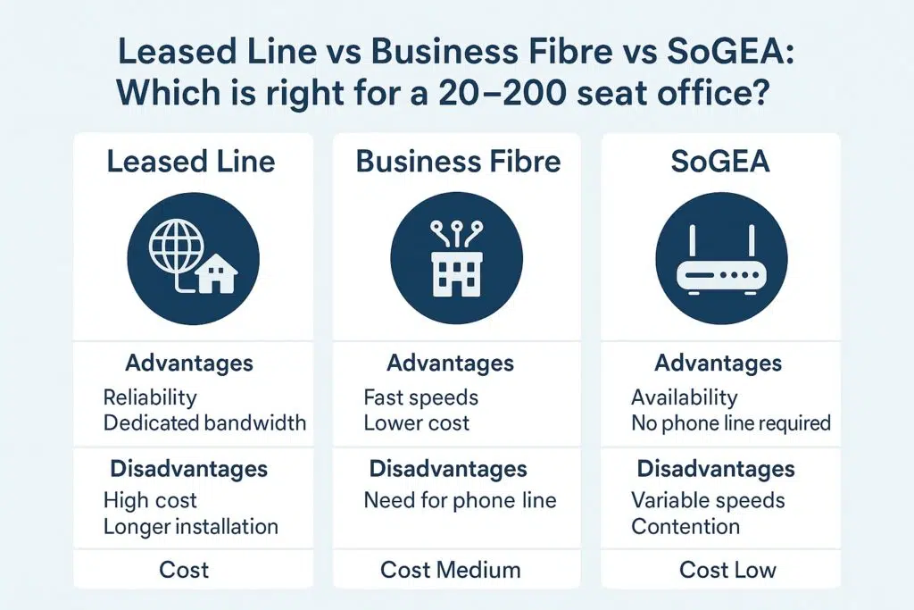 Leased Line vs Business Fibre vs SoGEA: Which Is Right for a 20–200 Seat Office?